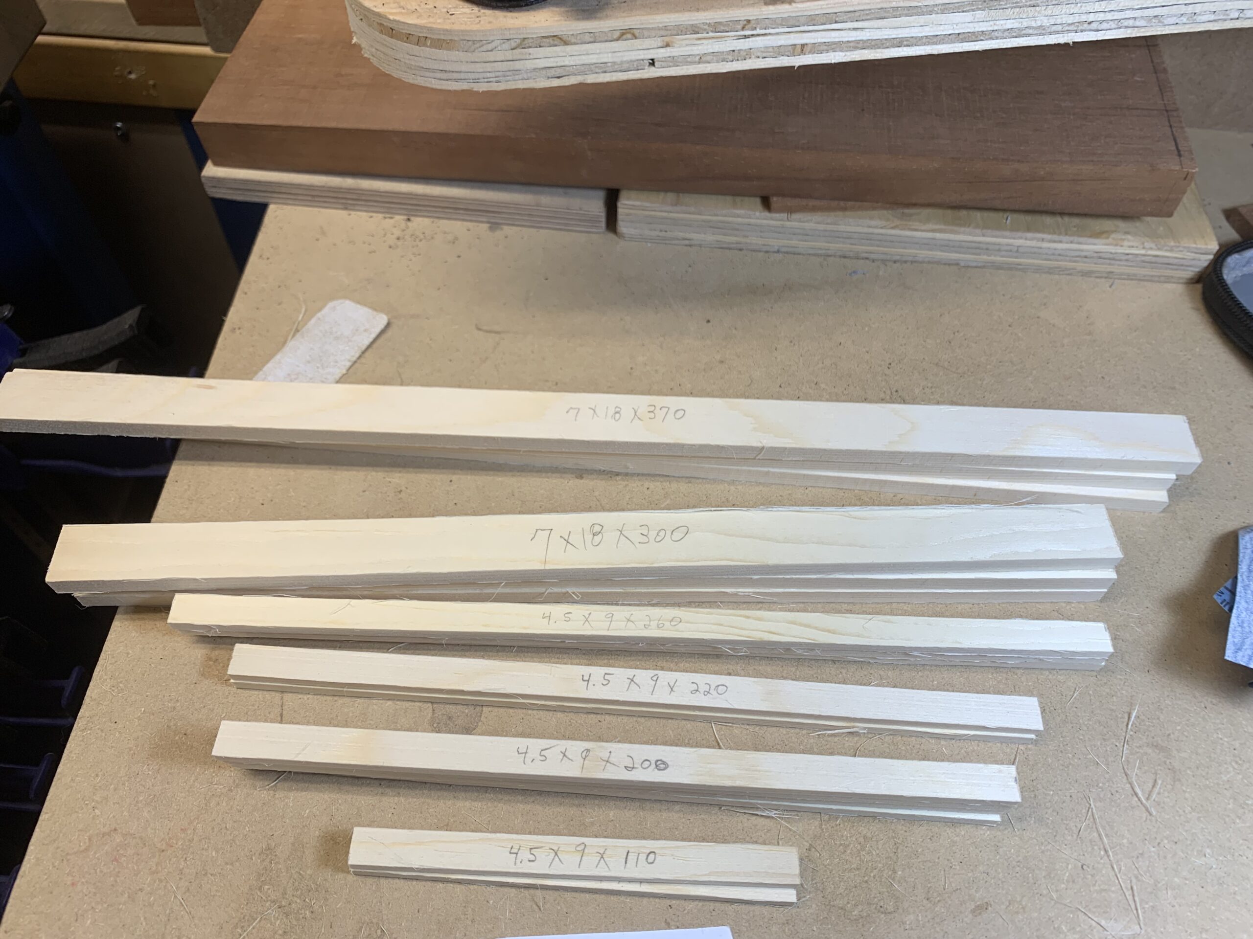 ![]() | A partir d’un bloc ,découper légèrement plus large les pièces de bois qui serviront de barrages en s’assurant qu’ils soient coupés sur cartier. Les hauteurs et largeurs sont: 9 X 4.5 mm et de 7 X18 mm au final. en coupant plus large, on peut finir avec le sableur d’épaisseur pour obtenir les dimensions précises. |
